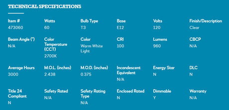Bulbrite 473060, 60 Watt Dimmable Clear T3 Candelabra (E12) Krypton/Xenon Light Bulb